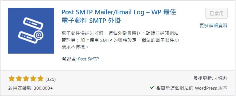 下載後啟用,之後有時間再做一篇關於 WP Mail 的,兩個都是郵件,不過還沒研究到那,之後如果那個比較好用再推薦給大家,目前 POST SMTP 已經足以用來接收大家寄給我的訊息還有系統通知這些基本功能了~